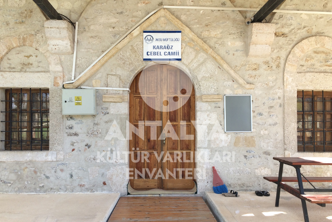 Cebel Cami; Antalya ili, Aksu ilçesi sınırları içerisinde, Karaöz Mahallesi Pazarönü mevkisinde, 1873 yılında Osmanlı Dönemi’nde yaptırılmış dikdörtgen planlı bir camidir. Cami, moloz yığma taştan geniş duvarlı olarak inşa edilmiş olup sonradan yapılmış, kiremit örtülü bir kırma çatı ile kapatılmıştır. Caminin yanında eski, tarihi bir mezarlık bulunmaktadır.