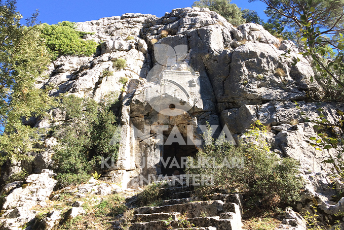 Tek mezar odasından oluşan kaya mezarına erişim, kayaya oyulmuş 18 basamaklı bir merdivenle sağlanmaktadır. Kapı üstü basık kemer şeklinde yontulmuş, içi Medusa başı ile süslenmiş ve iki yanına kartal kabartmaları yerleştirilmiştir. Günümüzde kaya mezarı kaçakçılar tarafından tahrip edilmiş; kartal ve Medusa kabartmaları büyük oranda yok edilmiştir. Patlama sonucunda mezarın önüne düşen kartal kabartması bugün hâlâ görülebilir durumdadır.