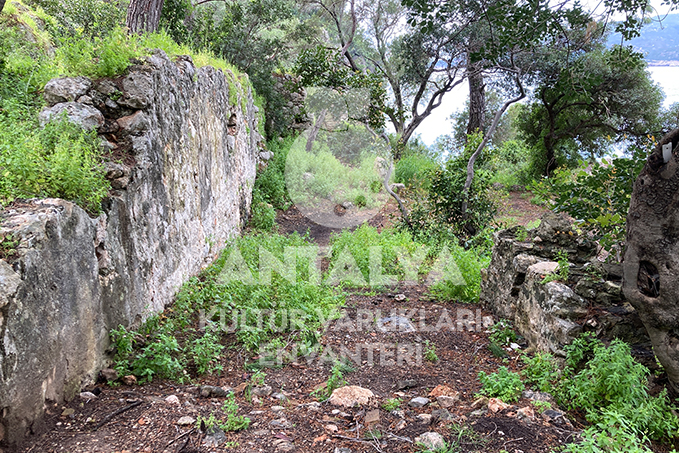 Üç tarafı surlarla çevrili olan kente; limanın güneyinden batı yönünde tepeye çıkan bir patika vasıtasıyla ulaşılmaktadır. Giriş kapısı, güney surlarının dışına inşa edilmiş dikdörtgen bir kulenin yanında bulunmaktadır. MS 5. yüzyılda inşa edildiği tahmin edilen surların bu kısmı oldukça iyi korunmuştur.