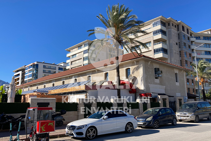 Antalya Limanına ulaşan sahil yolunun kuzeyinde, Hurma Mahallesinin girişinde yer alan yapılardan birincisi bulunduğu yapı adasının doğusunda, doğu-batı doğrultusunda uzanan dikdörtgen formlu bir yapıdır. Kırma çatılı olan yapı yaklaşık olarak 42×13 metre ölçülerindedir. Dört cephesinde iki sıra halinde dikdörtgen formlu demir şebekeli pencereleri ve güney cephesinde iki büyük kapısı varken batı cephe duvarı tamamen çökmüştür.